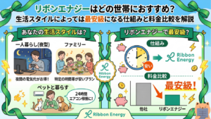 | 持ち家・オール電化・太陽光・複数割引が適用できる家庭 | 🎀 リボンエナジー | 割引が重なるほど単価が下がり、使えば使うほどお得。基本料金0円も魅力 |