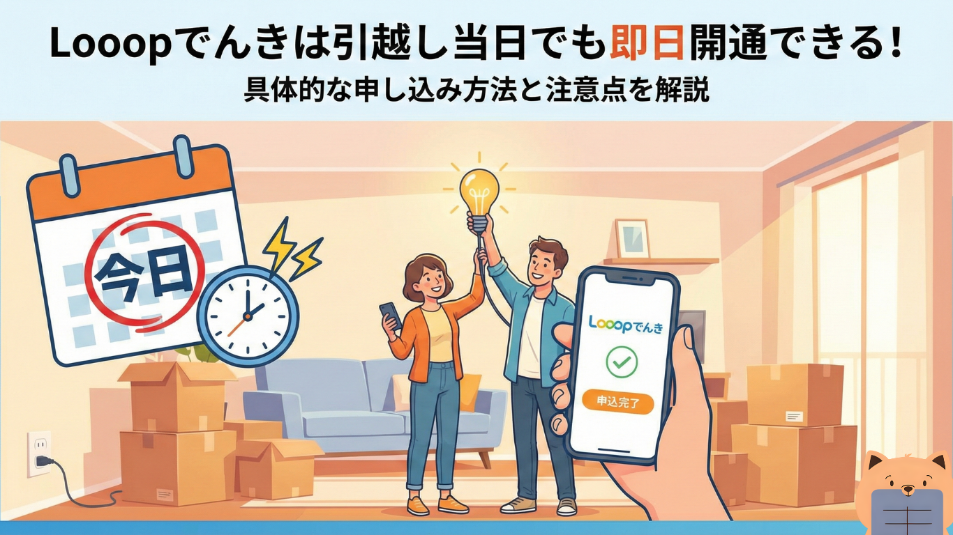 Looopでんきの即日開通は「引越しに伴う新規契約」に限定されています。すでに住んでいる住所で別の電力会社から切り替える場合(スイッチング)は即日対応されません。スイッチングの場合は現在の電力会社との解約処理・検針日との兼ね合いがあり、通常申し込みから数週間〜1ヶ月程度かかります。