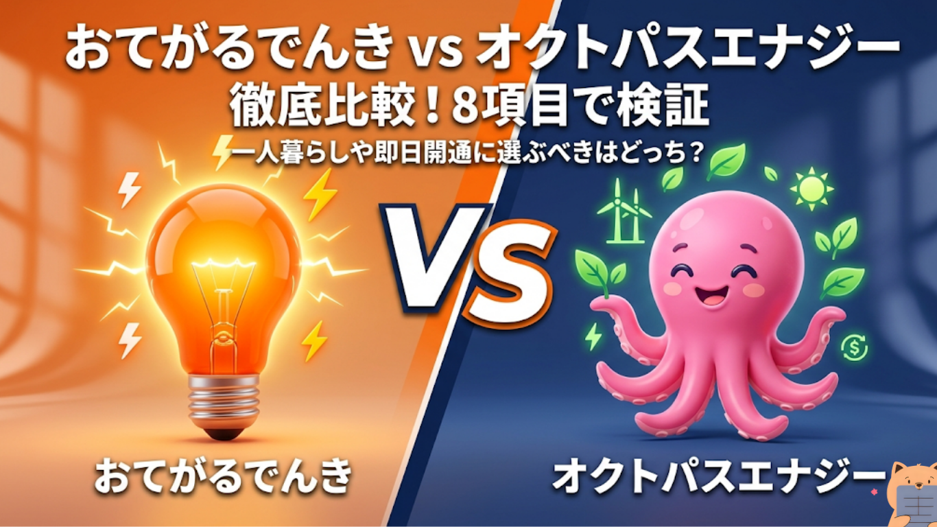 また料金面では、オクトパスエナジーは「シンプルオクトパス(基本料金・燃料費調整額0円・12ヶ月保証)」「グリーンオクトパス(実質再エネ100%)」など複数プランを持つのに対し、おてがるでんきは市場連動型のシンプルな一本立て。それぞれの特徴を深く理解したうえで選ぶことが、後悔しない乗り換えにつながります。本記事では8項目で両社を徹底比較し、どんなユーザーにどちらが向いているかをわかりやすく解説します。