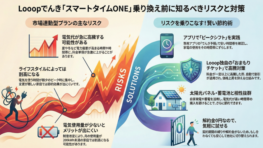 Looopでんきの「スマートタイムONE」は、電気代を大きく削減できる可能性を秘めている一方で、市場連動型ならではのリスクや注意点も存在します。
