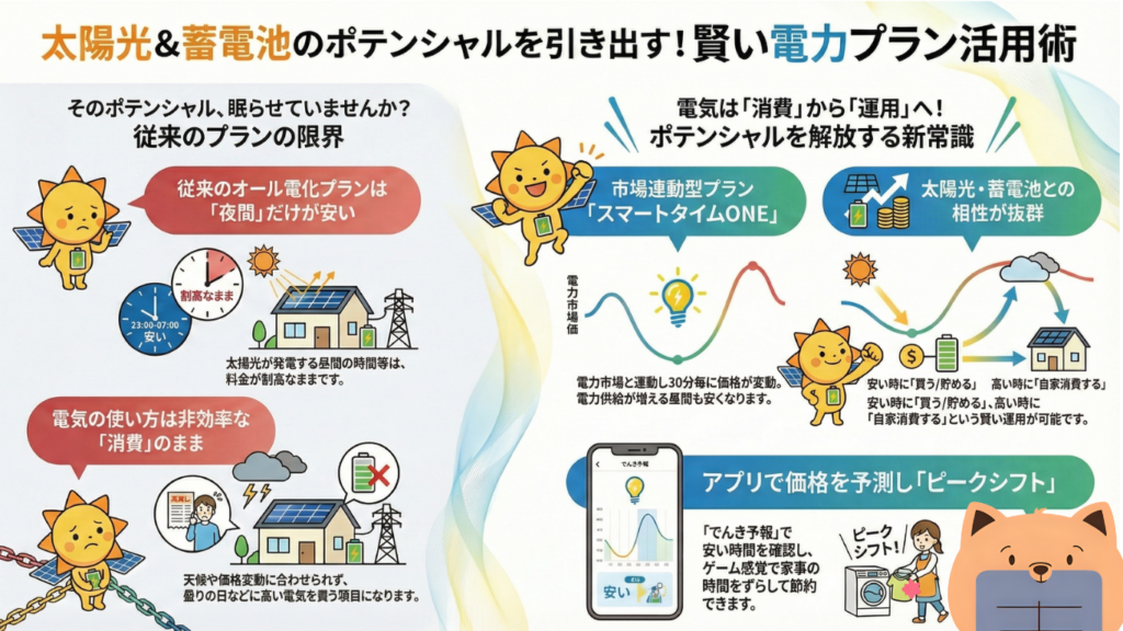 競合となる従来のオール電化プランと比較して、「昼間の電気が安くなるチャンスがある」という点が独自の売りであり、日中の買電単価が高いというこれまでの常識を覆します 。