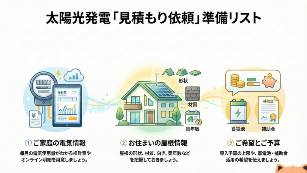 より正確な見積もりを取得するためには、いくつかの情報を事前に準備しておくとスムーズです。まず重要なのが、電気使用量に関する情報です。毎月の電気代や電力使用量が分かれば、どの程度の発電容量が必要かを算出できます。電力会社から届く検針票や、オンラインで確認できる使用量データを手元に用意しておくとよいでしょう。