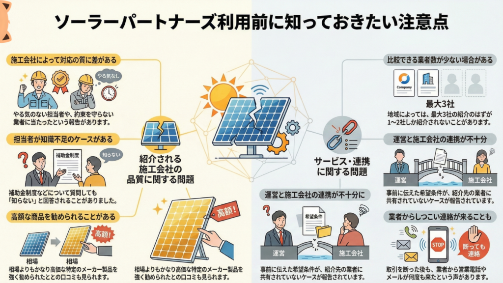 一方で、紹介される業者数が最大3社までという点や、紹介された施工会社の対応品質にばらつきがあるという声も一部見られます。また、ソーラーパートナーズと提携業者の連携に課題を感じたという口コミもあります。こうしたデメリットも理解した上で、自分のニーズに合っているかどうかを判断することが重要です。