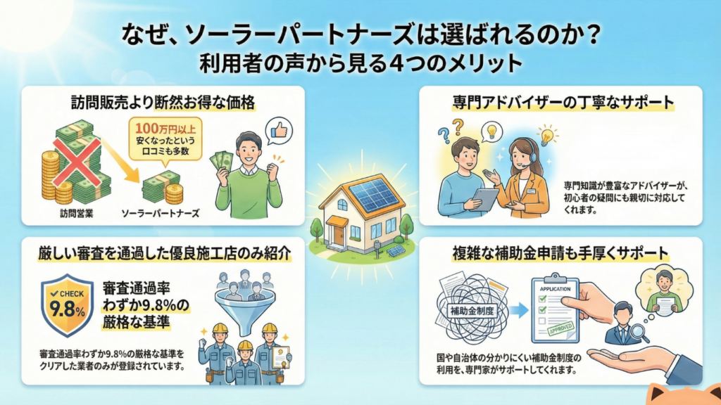 さらに、地域に応じた最適な業者をスピーディーに紹介してもらえる点や、複雑な補助金申請の手続きをサポートしてもらえる点も利用者から好評です。これらの口コミから、ソーラーパートナーズが単なる見積もり比較サイトではなく、導入の全過程をサポートする総合的なサービスとして機能していることが分かります。