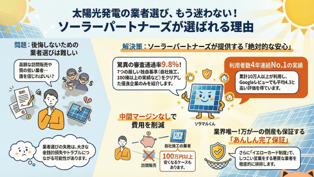 また、あまりに多くの見積もりを比較しようとすると、かえって判断に迷ってしまうケースもあります。ソーラーパートナーズでは、厳格な審査を通過した優良業者の中から、利用者の条件に最も合致する3社を選定して紹介しています。
