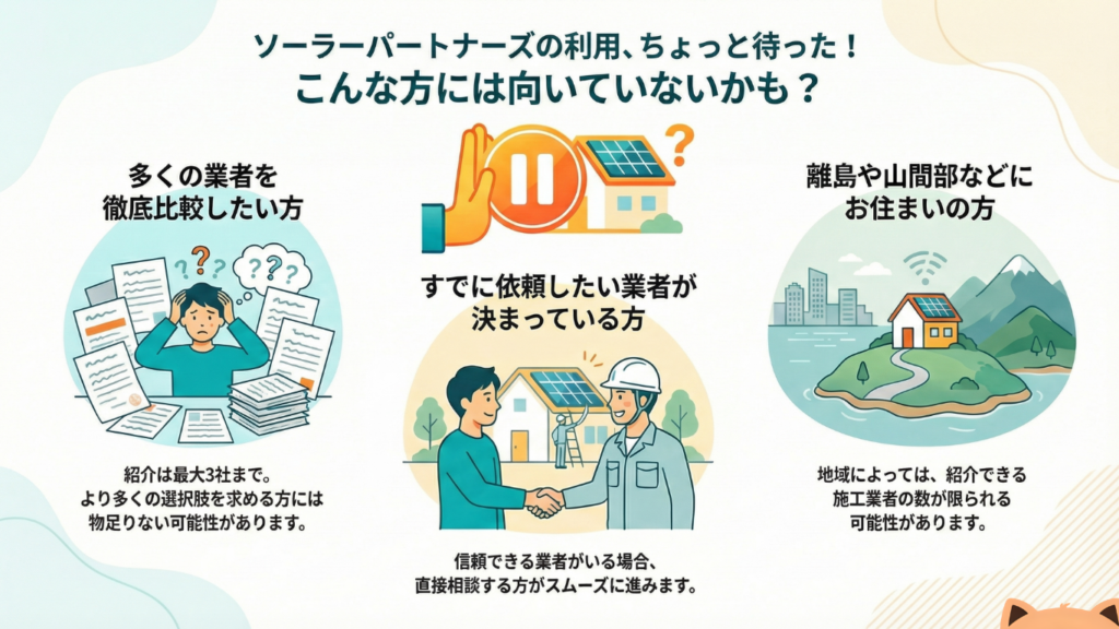 一方で、ソーラーパートナーズの利用が向いていない方もいます。まず、できるだけ多くの業者から見積もりを取って徹底的に比較検討したいという方には物足りなさを感じる可能性があります。
