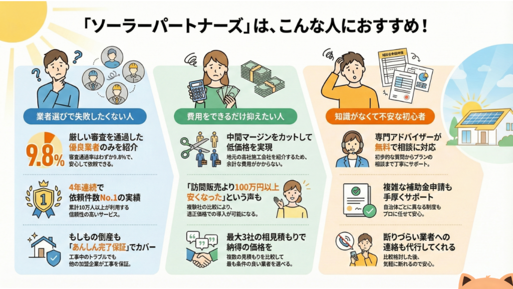 ソーラーパートナーズは、初めて太陽光発電を導入する方や、信頼できる業者を効率的に探したい方、できるだけ費用を抑えて導入したい方に特におすすめできるサービスです。